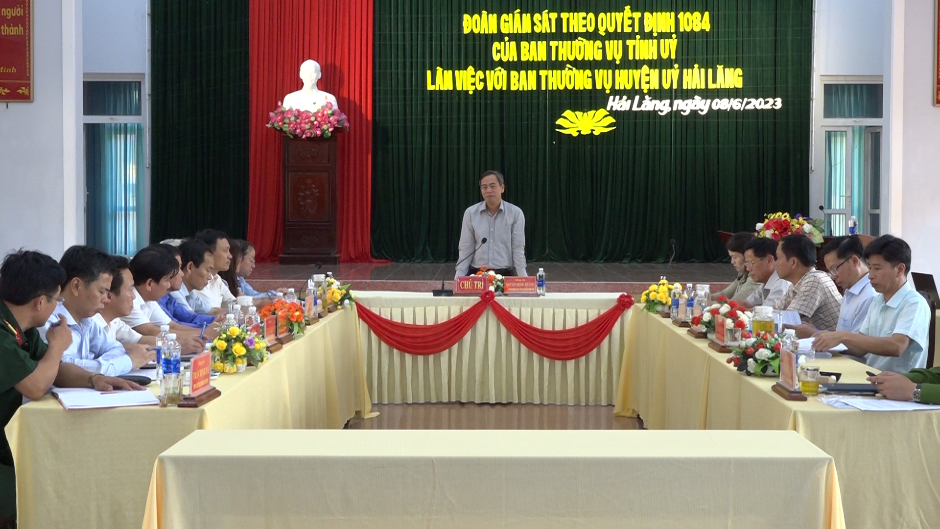 Tại buổi làm việc, Ban Thường vụ Huyện ủy Hải Lăng đã báo cáo kết quả tự giám sát theo nội dung Quyết định số 1084-QĐ/TU ngày 11/5/2023 của Ban Thường vụ Tỉnh ủy. Đồng thời tham gia nội dung dự thảo báo cáo kết quả giám sát của Đoàn đối với Ban Thường vụ Huyện ủy; đồng chí Lê Thế Quảng-TUV, Bí thư Huyện ủy, Chủ tịch HĐND huyện; đồng chí Hoàng Thị Phương Nam-Phó Bí thư Thường trực Huyện ủy; đồng chí Lê Đức Thịnh-Phó Bí thư, Chủ tịch UBND huyện Hải Lăng. Đặc biệt, Ban Thường vụ Huyện ủy Hải Lăng đã kiến nghị Đoàn giám sát quan tâm và đề xuất Ban Thường vụ Tỉnh ủy cho chủ trương để huyện Hải Lăng phối hợp với các sở, ban ngành của tỉnh nghiên cứu xây dựng Đề án xây dựng và phát triển huyện Hải Lăng đến năm 2035, tầm nhìn đến năm 2050 làm căn cứ để Ban thường vụ Tỉnh ủy ban hành Nghị quyết chuyên đề cho huyện Hải Lăng phát triển trong giai đoạn tới.