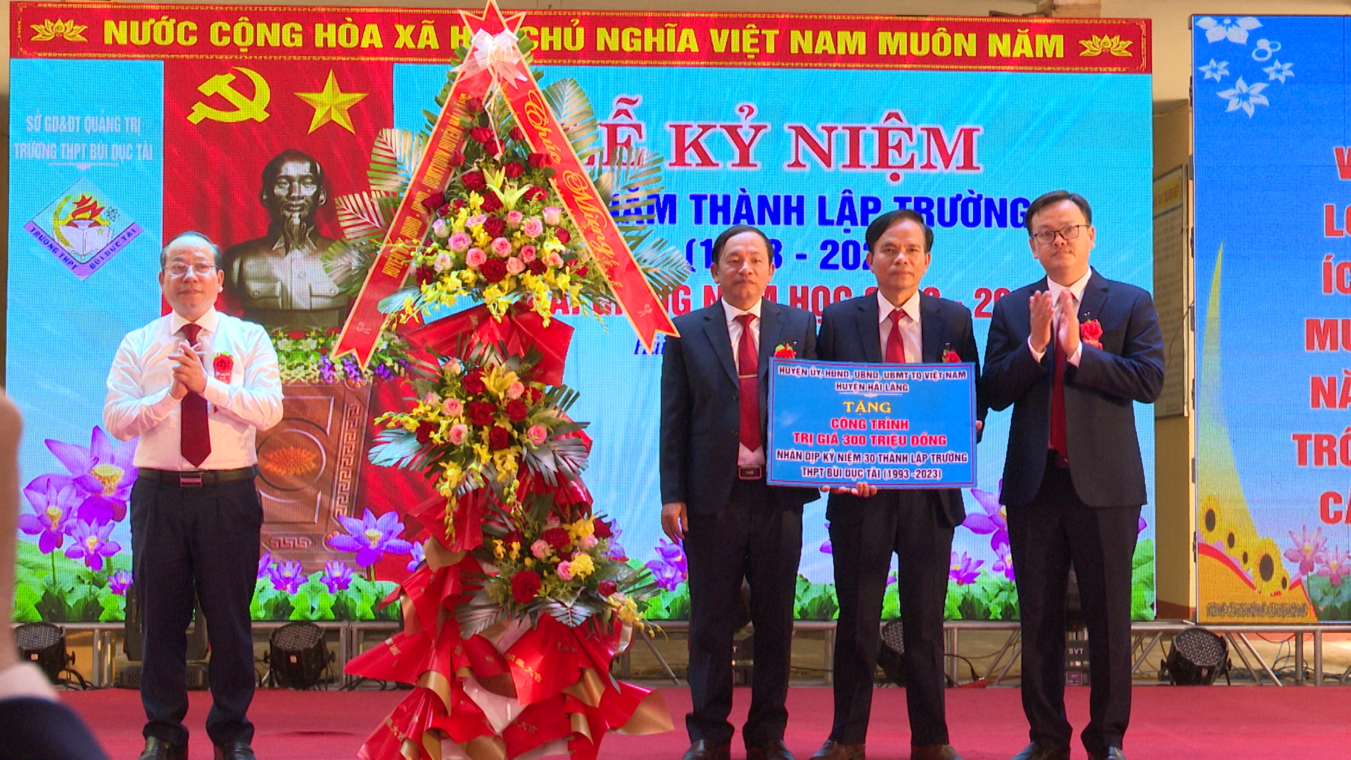 Lãnh đạo huyện Hải Lăng tặng hoa chúc mừng và trao tặng công trình trị giá 300 triệu đồng cho nhà trường.