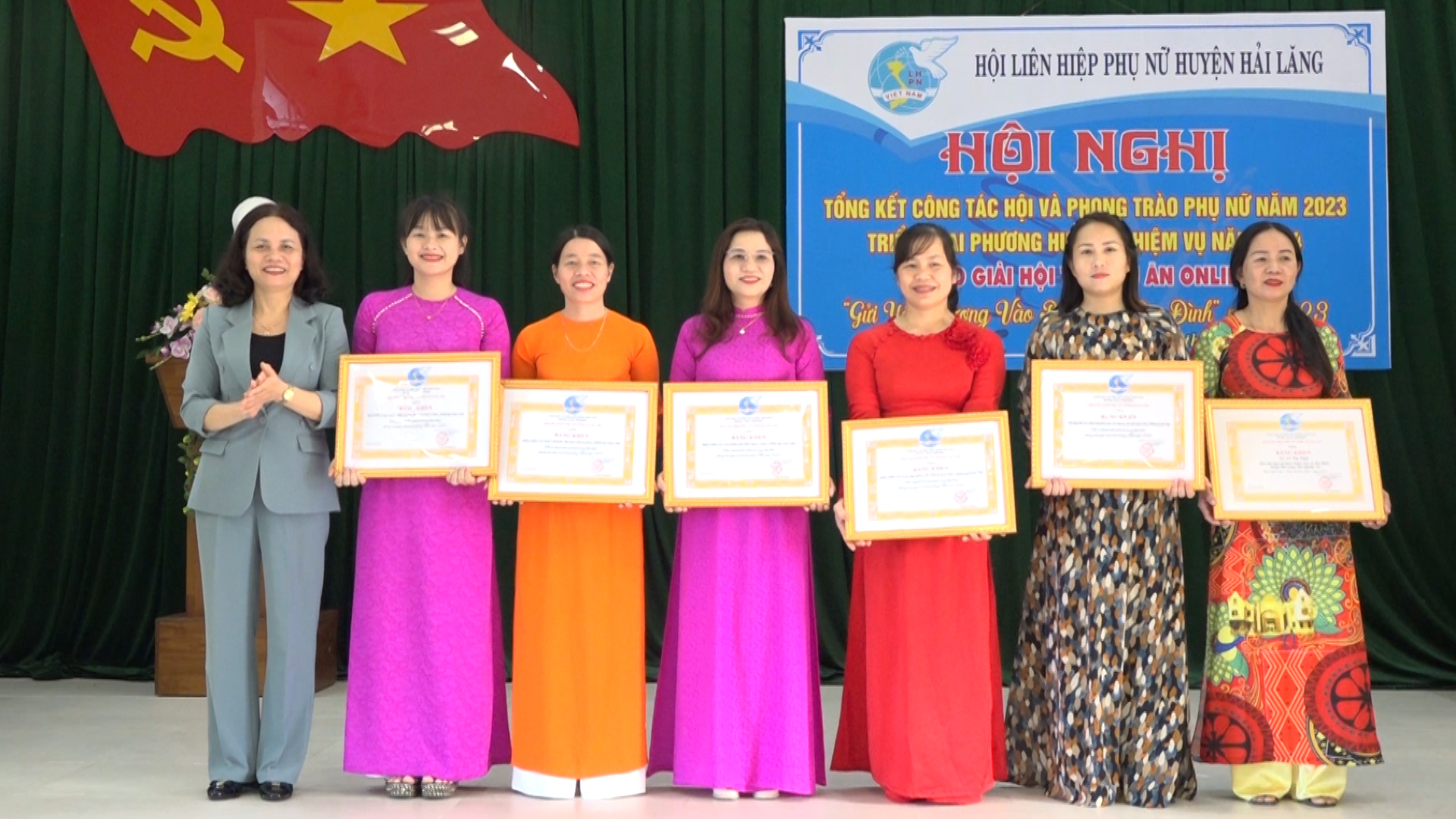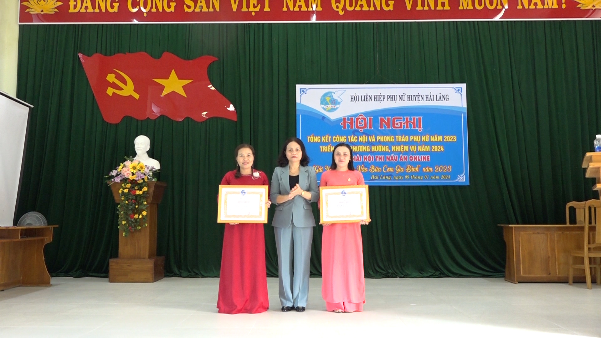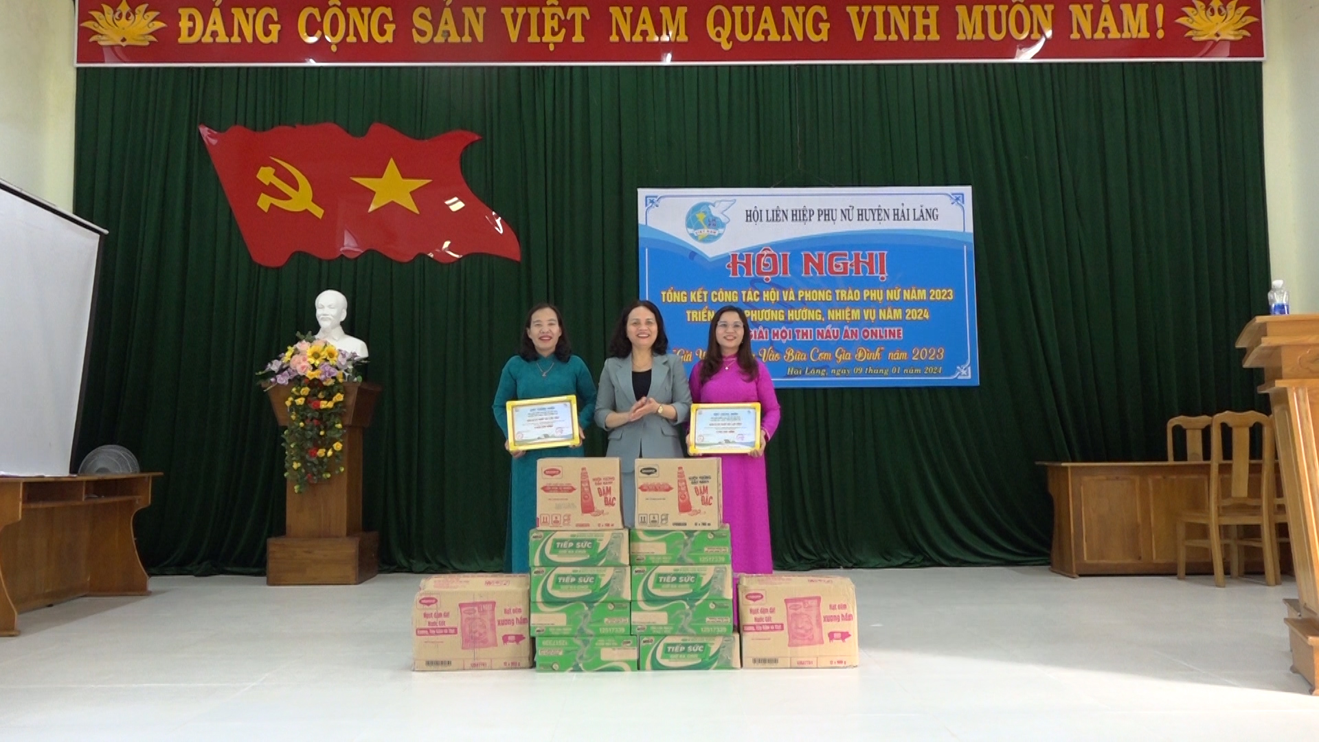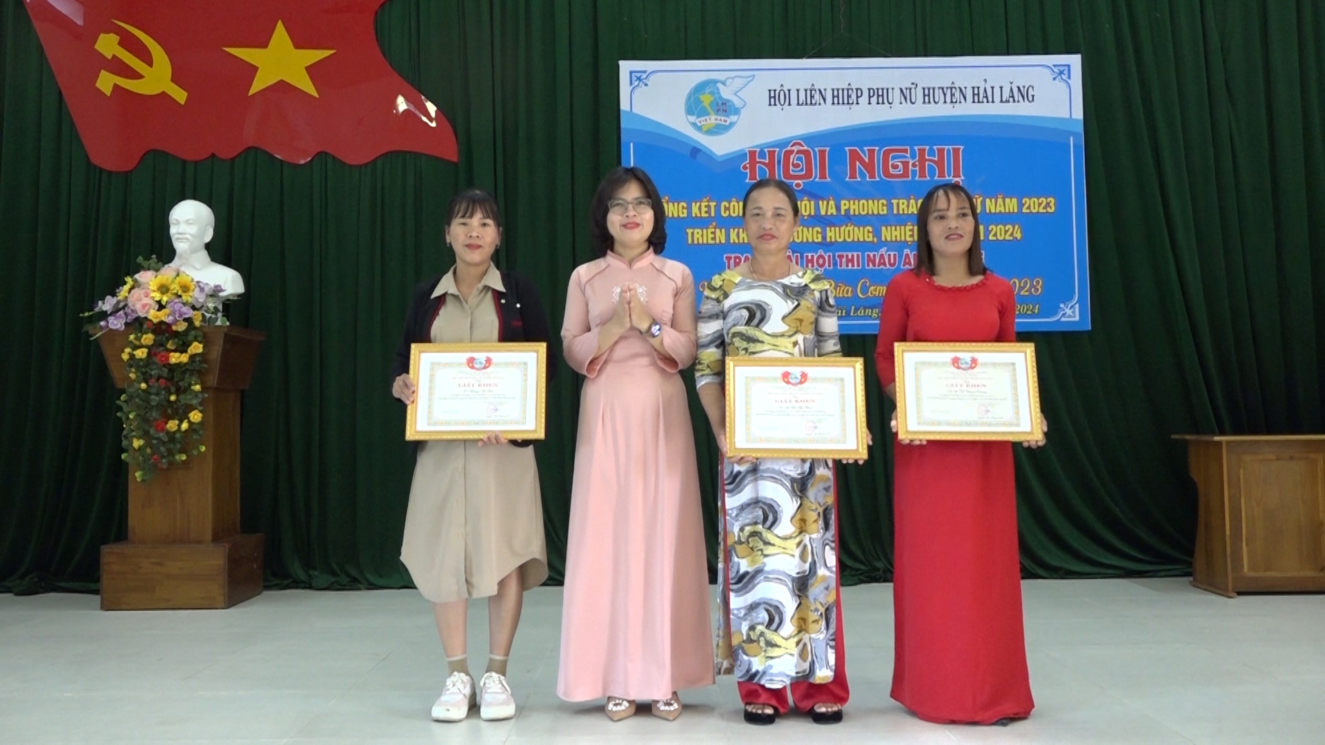 Hội nghị đã tổ chức ký kết giao ước thi đua năm 2024. Dịp này, TW Hội LHPN Việt Nam, Hội LHPN tỉnh Quảng Trị, UBND huyện Hải Lăng và Hội LHPN huyện Hải Lăng đã tặng bằng khen cho các tập thể, cá nhân có thành tích xuất sắc trong phong trào phụ nữ và hoạt động hội năm 2023. Trao giấy chứng nhận và quà cho 2 tập thể đạt danh hiệu đơn vị xã xuất sắc cấp tỉnh trong thực hiện chương trình “Nestle đồng hành cùng phụ nữ” năm 2023 và trao 1 giải Nhất, 2 giải Nhì, 3 giải Ba và 10 giải Khuyến khích hội thi nấu ăn online “Gửi yêu thương vào bữa cơm gia đình”./.