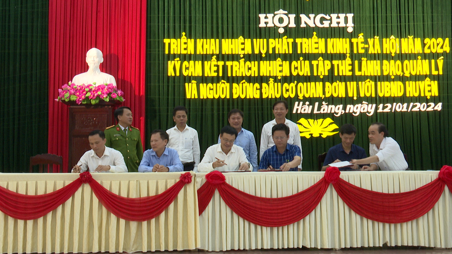 UBND huyện Hải Lăng vừa tổ chức hội nghị triển khai nhiệm vụ phát triển KT-XH năm 2024 và tổ chức ký cam kết trách nhiệm của tập thể lãnh đạo, quản lý và người đứng đầu với UBND huyện về thực hiện các nhiệm vụ trọng tâm năm 2024.