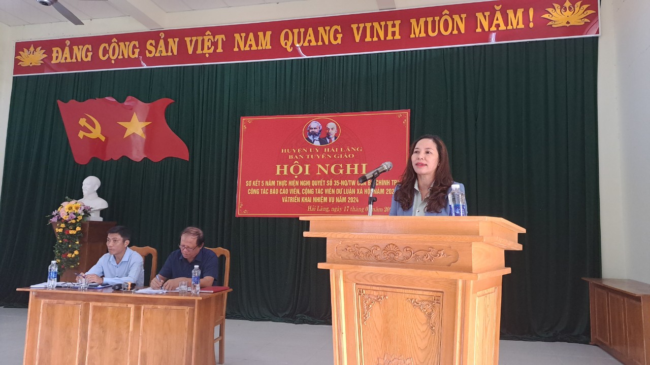 Sau 5 năm thực hiện nghị quyết 35, công tác bảo vệ nền tảng tư tưởng của Đảng, đấu tranh phản bác các quan điểm sai trái, thù địch trên địa bàn huyện Hải Lăng đã được các cấp ủy Đảng, chính quyền chỉ đạo thực hiện nghiêm túc. Hoạt động của Ban Chỉ đạo 35 huyện và tổ giúp việc từng bước đi vào nền nếp, nội dung, hình thức hoạt động có nhiều đổi mới, thích ứng với tình hình thực tiễn. Công tác thông tin tuyên truyền, định hướng các chủ trương, đường lối của Đảng, chính sách, pháp luật của Nhà nước, đấu tranh phản bác các thông tin xuyên tạc, bịa đặt của các thế lực thù địch được triển khai toàn diện, kịp thời. Đặc biệt quan tâm gắn công tác tuyên truyền, giáo dục với công tác nắm bắt tình hình tư tưởng, dư luận để phản ánh, chỉ đạo giải quyết kịp thời các luồng ý kiến, dư luận trái chiều của cán bộ, đảng viên và các tầng lớp nhân dân, góp phần củng cố lòng tin của Nhân dân đối với sự lãnh đạo, chỉ đạo của Đảng và quản lý, điều hành của chính quyền các cấp.