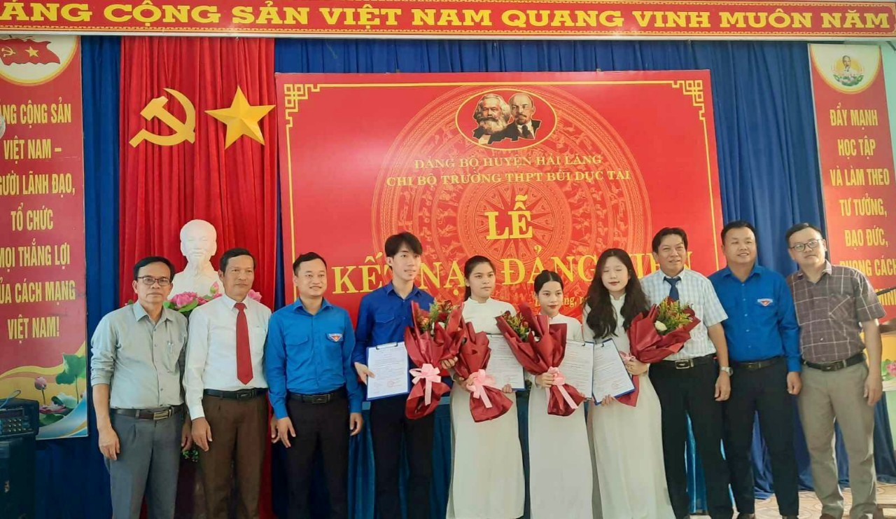 Thực hiện Kế hoạch số 111-KH/HU ngày 01/11/2023 của Huyện ủy Hải Lăng về đẩy mạnh công tác phát triển đảng trong đoàn viên ở khu dân cư và trong học sinh ở các trường THPT, trong thời gian qua, Chi bộ trường THPT Bùi Dục Tài đã xây dựng và triển khai thực hiện kế hoạch về bồi dưỡng, phát triển Đảng viên mới trong học sinh gắn với mô hình “Đảng viên tuổi 18”, tạo động lực để các em học sinh nỗ lực phấn đấu, rèn luyện và trưởng thành. Thực hiện các quyết định kết nạp đảng viên của Huyện uỷ Hải Lăng, ngày 18 tháng 6 năm 2024, Chi bộ Trường THPT Bùi Dục Tài tổ chức trang trọng Lễ kết nạp đảng viên đối với 04 quần chúng là học sinh ưu tú theo mô hình “Đảng viên tuổi 18”.