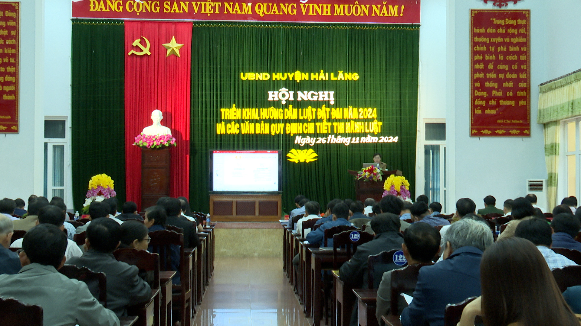Ngày 26/11, UBND huyện Hải Lăng tổ chức Hội nghị triển khai, hướng dẫn Luật Đất đai năm 2024 và các văn bản quy định chi tiết. Dự hội nghị có các đ/c trong BTV Huyện ủy; đại diện Thường trực HĐND, UBMTTQVN, UBND huyện; đại diện lãnh đạo các cơ quan, ban, ngành, tổ chức chính trị xã hội huyện; đại diện Thường trực HĐND, UBMTTQVN , công chức địa chính, tư pháp các xã, thị trấn; Bí thư chi bộ, Trưởng thôn, khóm.