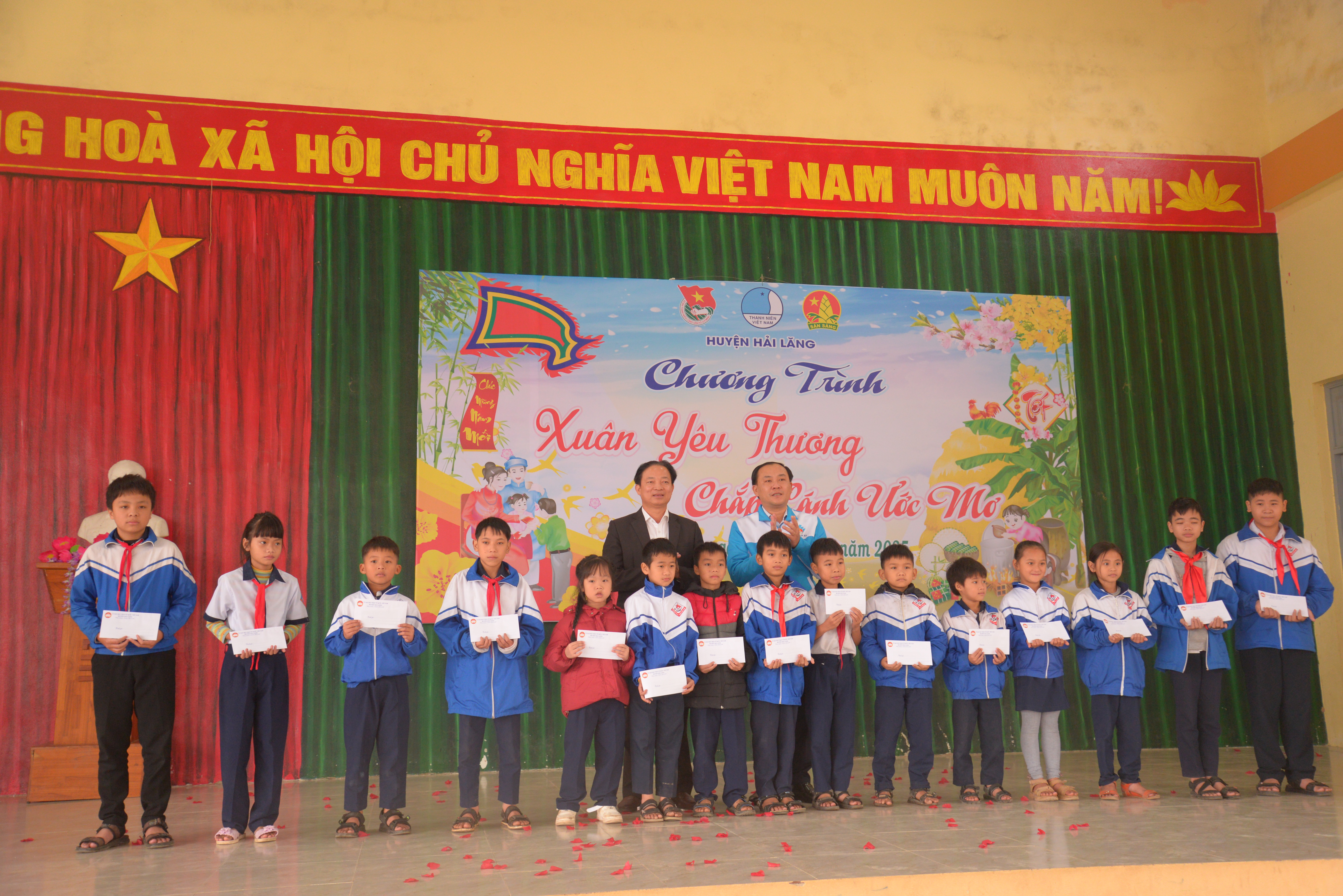 Đ/c Phạm Xuân Khánh, Phó Bí thư Thường trực Tỉnh Đoàn, Chủ tịch Hội Đồng Đội tỉnh Quảng Trị và đ/c Cáp Xuân Tá – Huyện ủy viên, Phó Chủ tịch UBND huyện trao tặng 15 suất quà cho các em học sinh nghèo hiếu học, học sinh có hoàn cảnh khó khăn