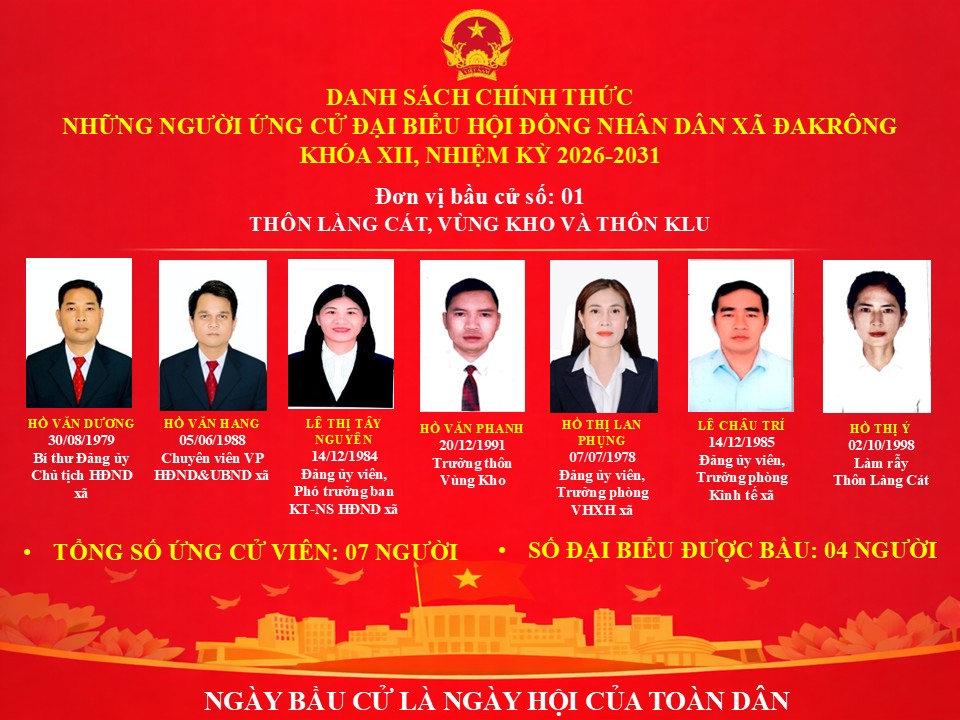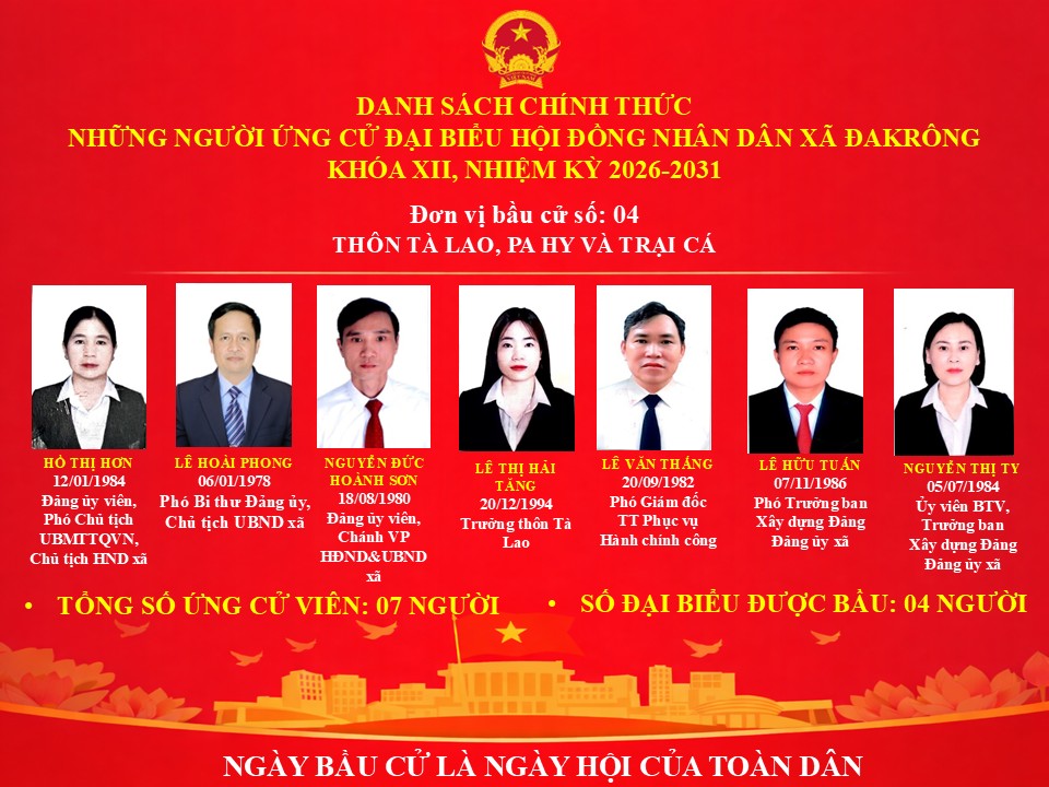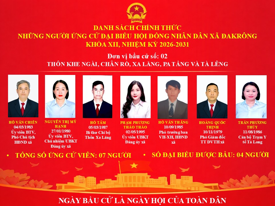 DANH SÁCH CHÍNH THỨC NHỮNG NGƯỜI ỨNG CỬ ĐẠI BIỂU HỘI ĐỒNG NHÂN DÂN XÃ ĐAKRÔNG KHÓA XII, NHIỆM KỲ 2026-2031