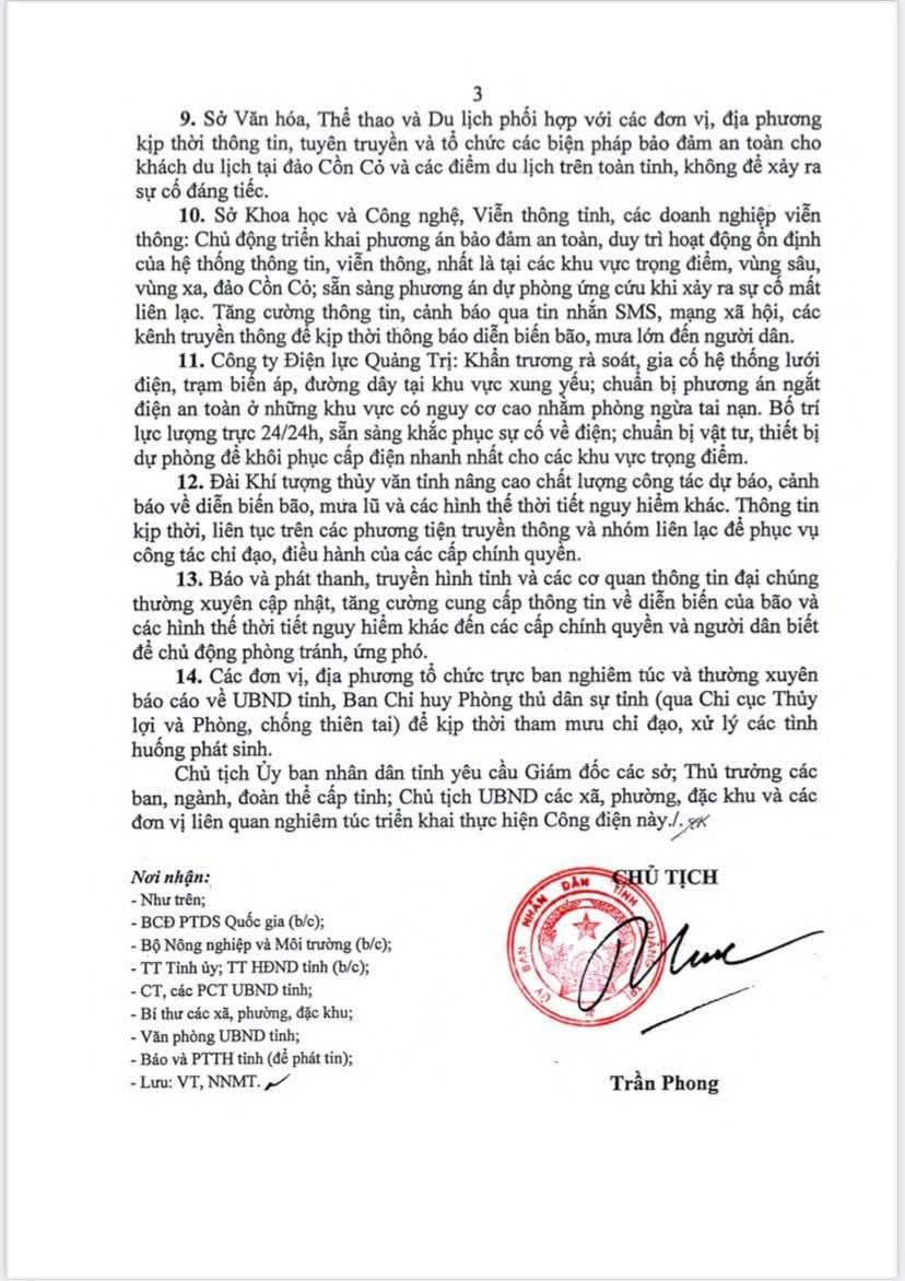 Ngày 26/9, Chủ tịch UBND tỉnh Quảng Trị Trần Phong ký Công điện số 12/CĐ - UBND gửi Ban Chỉ huy Phòng thủ dân sự tỉnh; giám đốc các sở; thủ trưởng các ban, ngành, đoàn thể cấp tỉnh; chủ tịch UBND các xã, phường và đặc khu Cồn Cỏ yêu cầu thực hiện ngay các giải pháp để ứng phó với bão BUALOI nhằm đảm bảo an toàn tính mạng cho người dân, giảm thiểu thiệt hại về tài sản