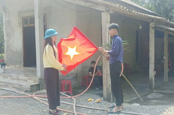 Lãnh đạo phòng VH-XH xã hướng dẫn người dân treo cờ trang trọng, đúng quy cách
