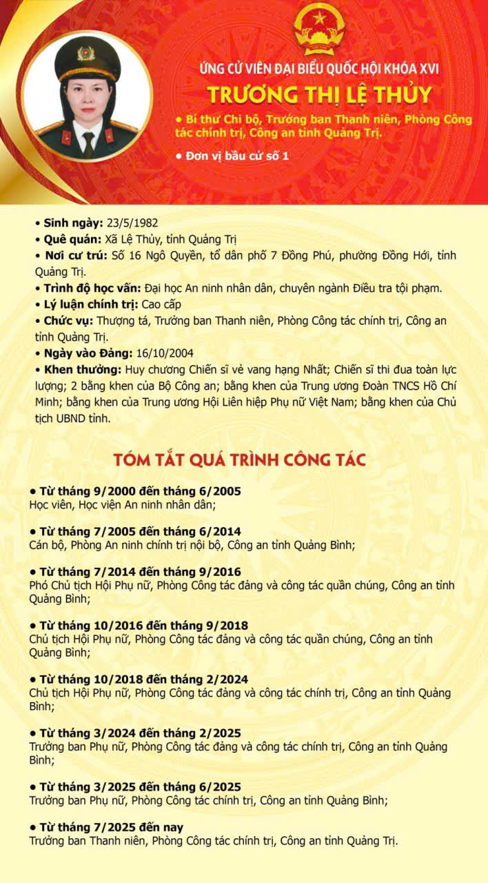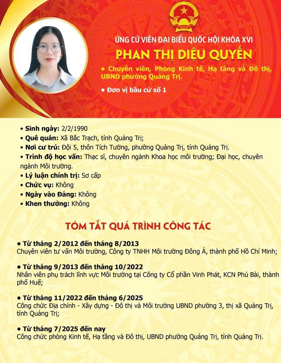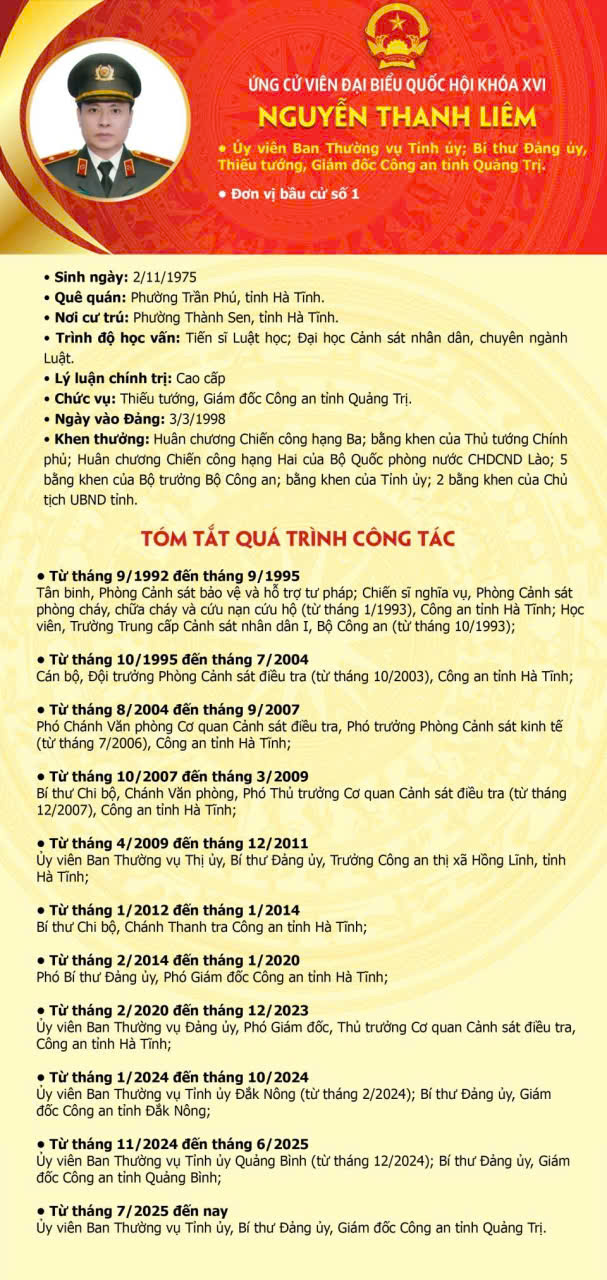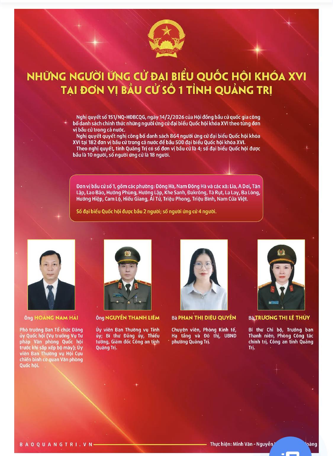 Danh sách và tiểu sử tóm tắt những người ứng cử Đại biểu Quốc hội khóa XVI tại đơn vị Bầu cử số 1 tỉnh Quảng Trị gồm các phường: Đông Hà, Nam Đông Hà và các xã Lìa, A Dơi, Tân Lập, Lao Bảo, Hướng Phùng, Hướng Lập, Khe Sanh, Đakrông, Tà Rụt, La Lay, Ba Lòng, Hướng Hiệp,, Cam Lộ, Hiếu Giang, Ái Tử, Triệu Phong, Triệu Bình, Nam Cửa Việt