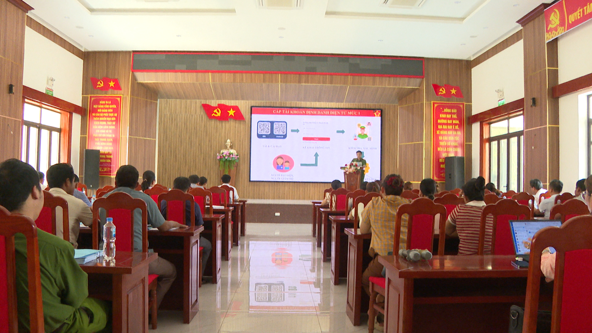 Tại Hội nghị, các học viên đã được báo cáo viên đến từ Công an xã hướng dẫn một số nội dung đó là: Giới thiệu một số ứng dụng tiện ích trên VneID; Hướng dẫn kích hoạt tài khoản định danh điện tử; Tuyên truyền về ý nghĩa, tầm quan trọng và lợi ích của việc sử dụng Sổ sức khoẻ điện tử, tài khoản hưởng an sinh xã hội trên ứng dụng VneID; Hướng dẫn các bước cài đặt Sổ sức khoẻ điện tử, tài khoản hưởng an sinh xã hội trên ứng dụng VNeID (chỉ thực hiện được với công dân có tài khoản định danh điện tử mức độ 2); Hướng dẫn các học viên tham gia lớp tập huấn tự thao tác và thực hiện tích hợp Sổ sức khoẻ điện tử, tài khoản hưởng an sinh xã hội trên ứng dụng VNeID (thực hiện trên điện thoại thông minh). Đồng thời, sẽ hỗ trợ giải đáp một số vướng mắc của học viên trong quá trình tập huấn.