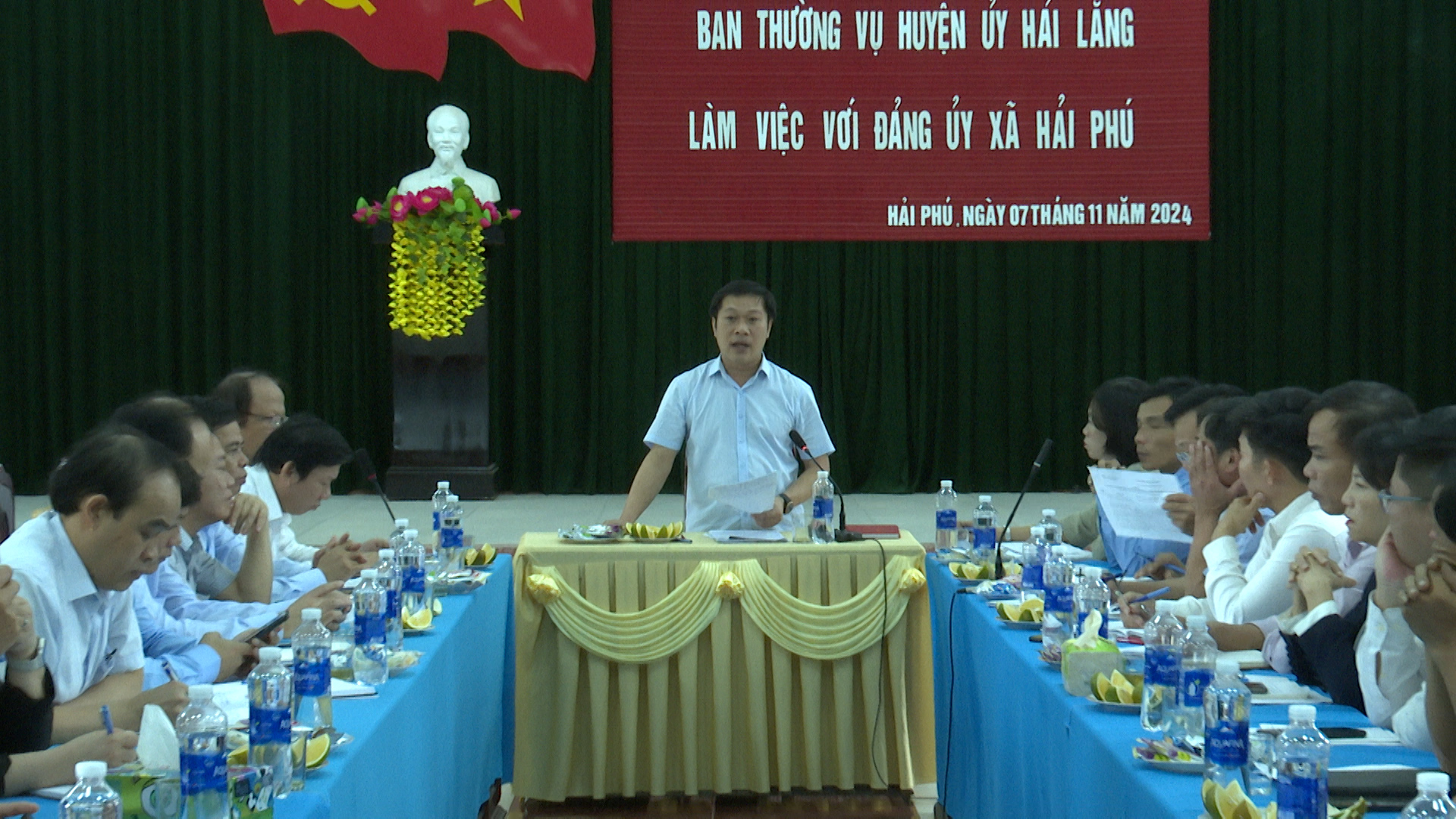 Phát biểu kết luận tại buổi làm việc, đ/c Nguyễn Khánh Vũ-TUV, Bí thư Huyện ủy ghi nhận những kết quả mà xã Hải Phú đạt được trong năm 2024. Đồng thời, đề nghị, trong thời gian tới, Đảng ủy xã cần đặt ra quyết tâm cao hơn để thực hiện thắng lợi các mục tiêu chỉ tiêu của năm và của Nghị quyết Đại hội Đảng bộ xã, nhiệm kỳ 2020-2025. Đồng thời làm tốt các khâu chuẩn bị cho Đại hội Đảng bộ xã nhiệm kỳ 2025-2030. Đặc biệt, đ/c Bí thư Huyện ủy yêu cầu xã Hải Phú cần tăng cường công tác quản lý đất đai, tài nguyên môi trường, quản lý trật tự xây dựng trên địa bàn xã; thực hiện tốt công tác quy chủ đất; tăng cường công tác kiểm tra, giám sát và xử lý các hành vi sử dụng đất sai mục đích; Thực hiện tốt công tác quản lý quy hoạch theo Đồ án Quy hoạch chung đô thị mới La Vang đã được UBND tỉnh phê duyệt.