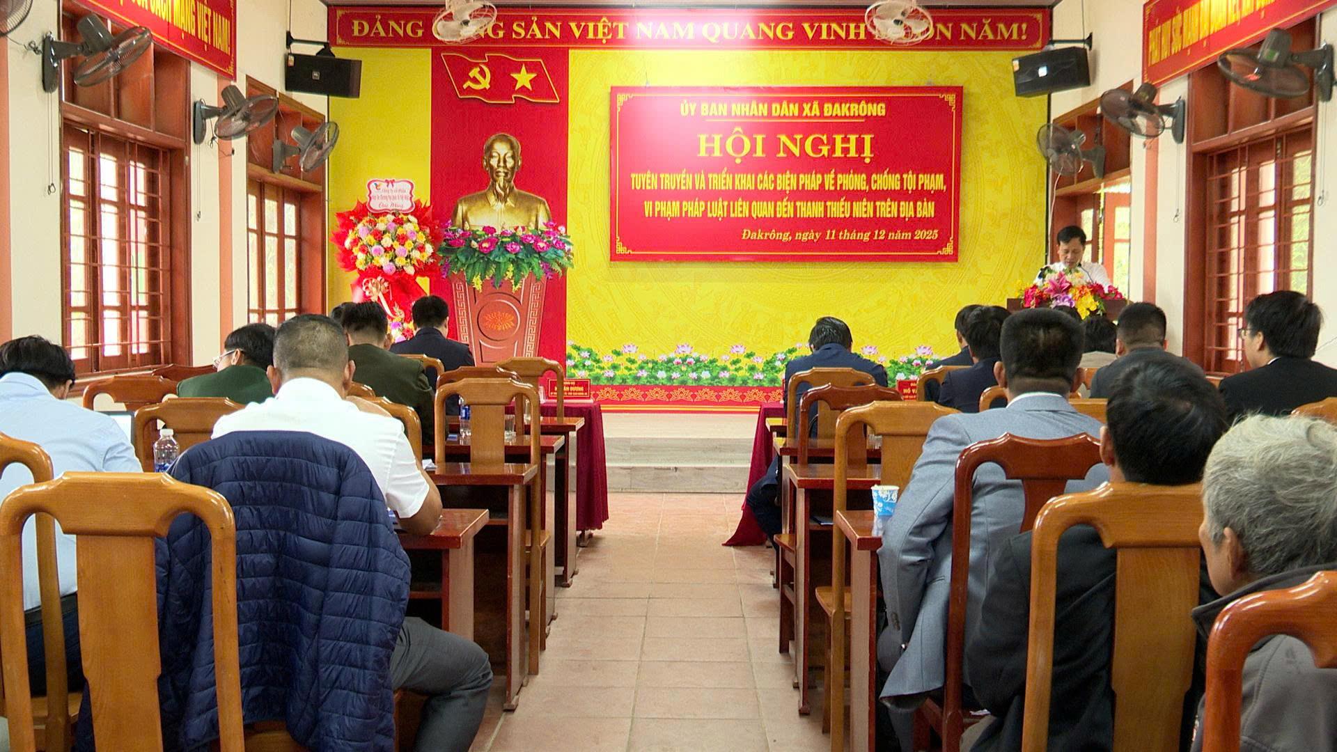 Ngày 11/12, UBND xã Đakrông đã tổ chức Hội nghị tuyên truyền và triển khai các biện pháp về phòng, chống tội phạm, vi phạm pháp luật liên quan đến thanh thiếu niên trên địa bàn. Tham dự Hội nghị có đại diện lãnh đạo Công an tỉnh Quảng Trị; về phía xã Đakrông có đồng chí Hồ Văn Dương, Bí thư Đảng ủy, Chủ tịch HĐND xã; đồng chí Lê Hoài Phong, PBT, Chủ tịch UBND xã cũng lãnh đạo các cơ quan, phòng ban, đơn vị; BQL các thôn, khóm trên địa bàn xã.