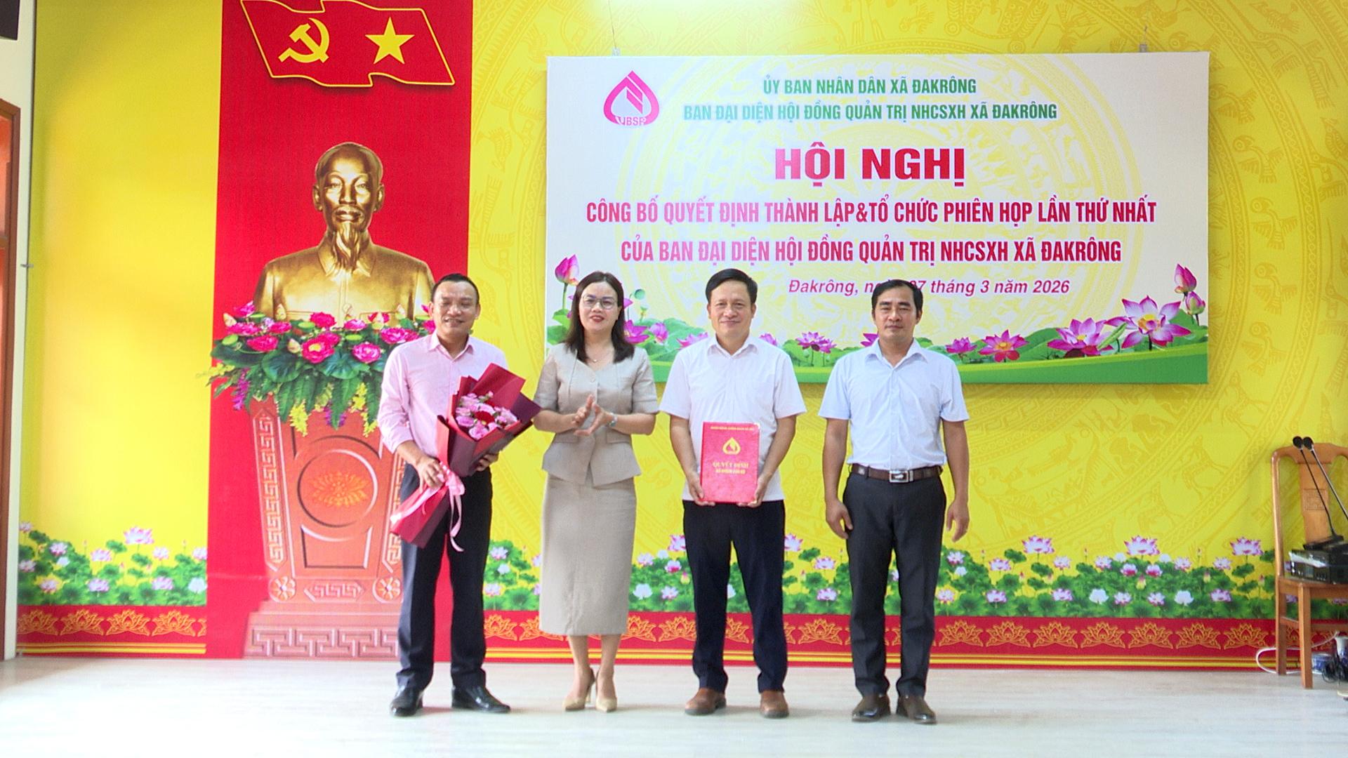 Chiều ngày 27/3/2026, UBND xã Đakrông tổ chức Hội nghị công bố Quyết định thành lập Ban đại diện Hội đồng quản trị Ngân hàng Chính sách xã hội xã. Tham dự Hội nghị có đồng chí Hồ Văn Dương, Bí thư Đảng ủy, Chủ tịch HĐND xã; đồng chí Lê Hoài Phong, PBT Đảng ủy, Chủ tịch UBND xã; Ban Giám đốc, cán bộ phòng giao dịch NHCSXH Đakrông; các thành viên Ban đại diện Hội đồng quản trị NHCSXH xã; đại diện lãnh đạo các cơ quan, đơn vị trên địa bàn xã; cùng tổ trưởng các tổ tiết kiệm và vay vốn trên địa bàn xã.
