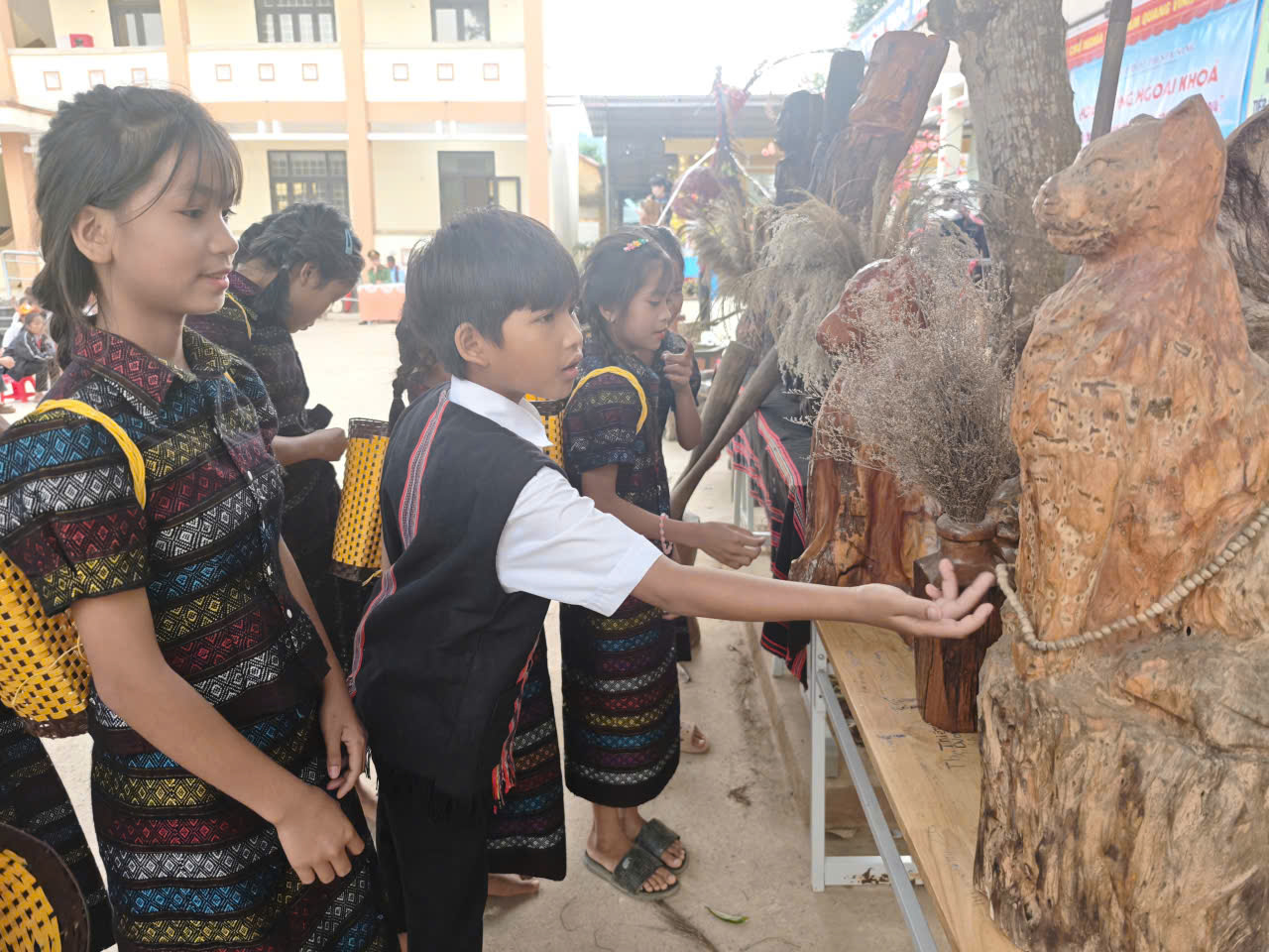 Tại buổi ngoại khóa, các em học sinh đã được trải nghiệm một không gian văn hóa đa dạng, kết hợp giữa việc trưng bày các mô hình sách sáng tạo và giới thiệu trực quan các giá trị văn hóa truyền thống. Đặc biệt, để cung cấp cái nhìn trực quan cho các em học sinh, nhà trường đã phối hợp với ông Hồ Văn Phương – nhà sưu tầm văn hóa dân tộc Vân Kiều, Pa Kô, đưa các hiện vật đặc trưng của người Vân Kiều, Pa Kô vào không gian ngoại khóa, giúp học sinh tận mắt chiêm ngưỡng và hiểu sâu sắc hơn về bản sắc phong phú của dân tộc mình.