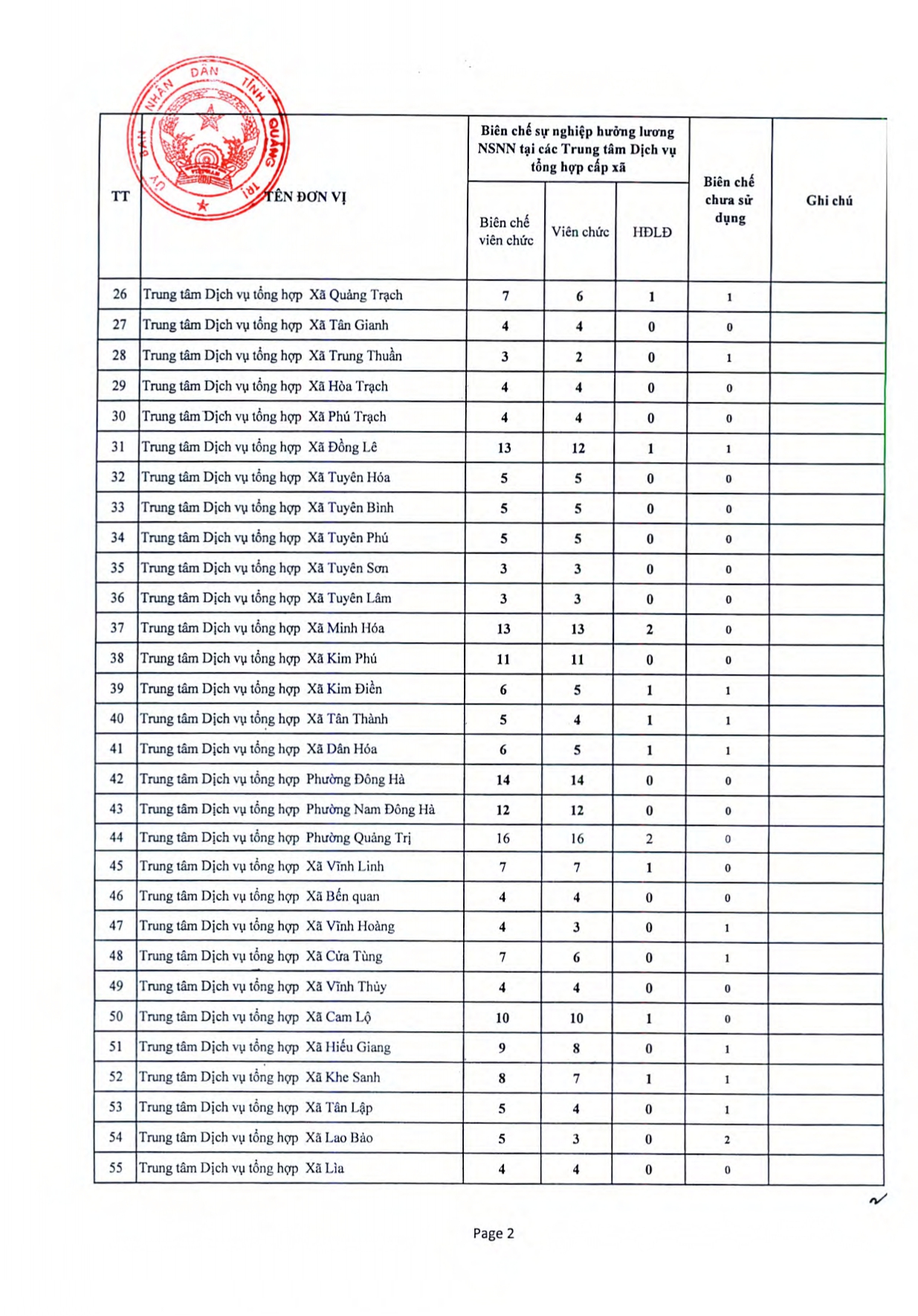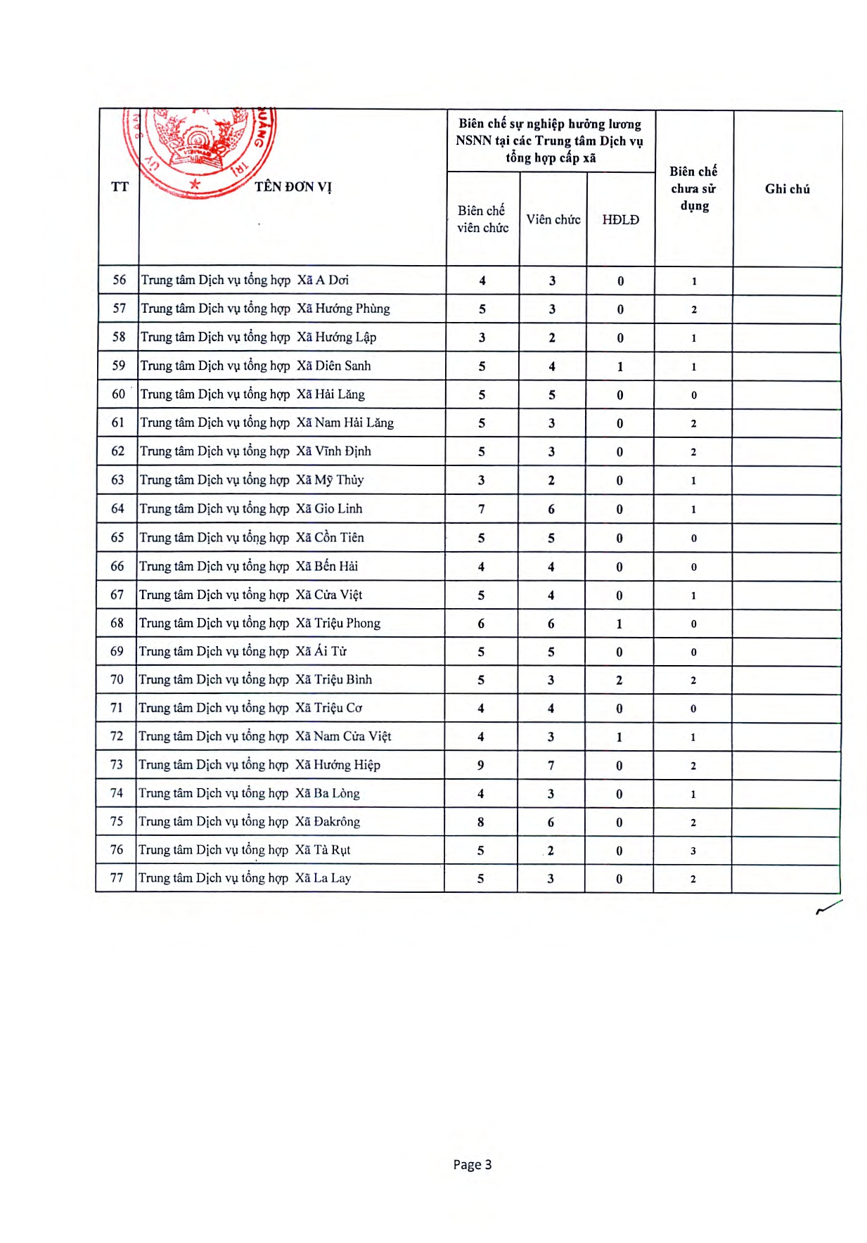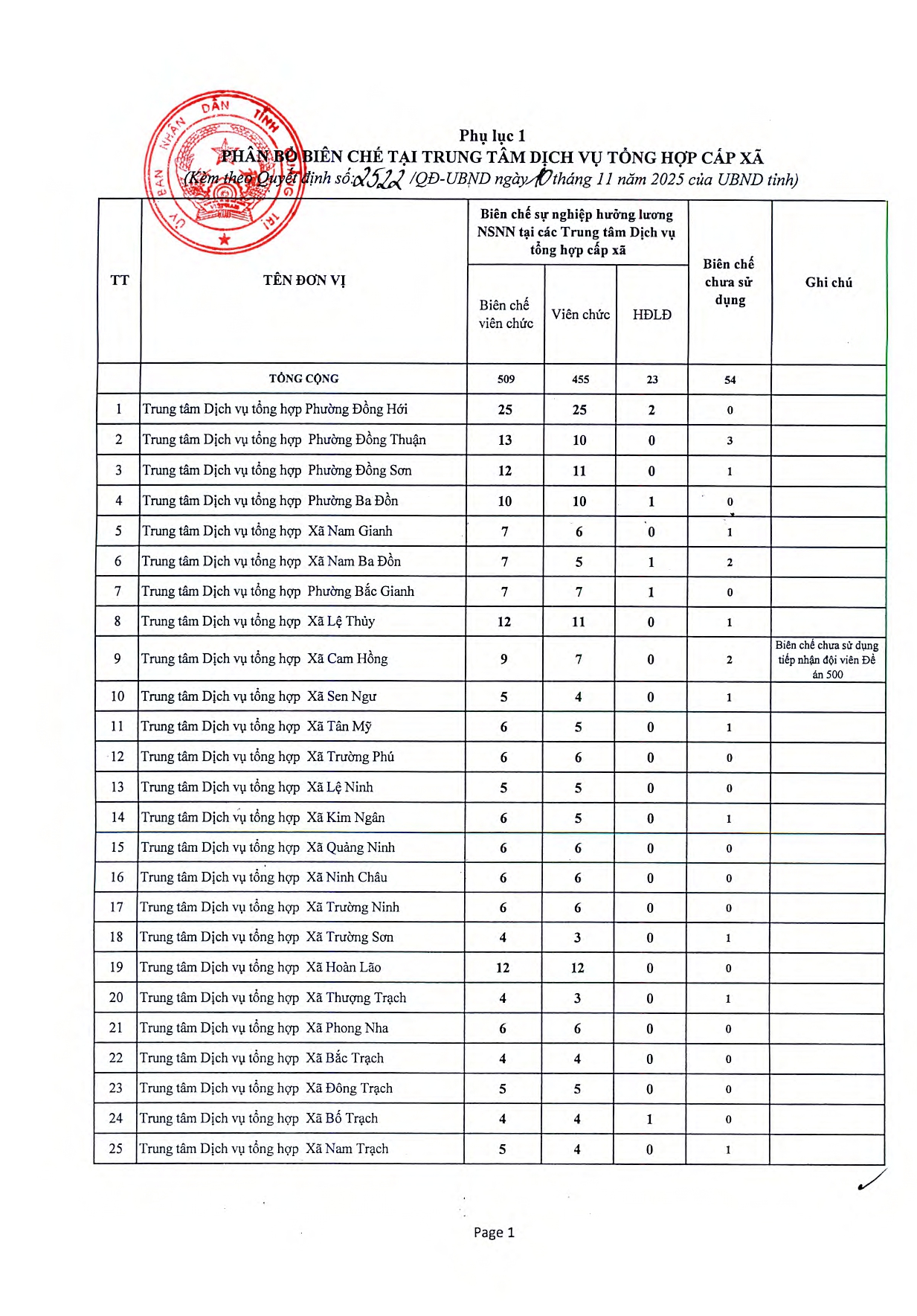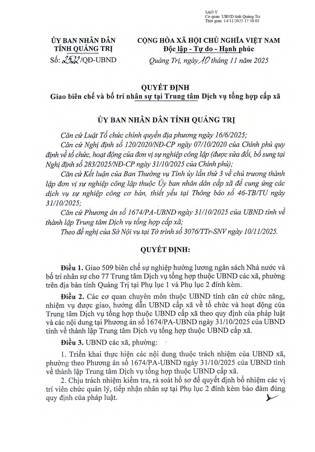 Ngày 10/11/2025, UBND tỉnh Quảng Trị ban hành Quyết định số 2522/QĐ-UBND tỉnh về giao biên chế và bố trí nhân sự tại Trung tâm Dịch vụ tổng hợp cấp xã. Theo đó, giao 509 biên chế sự nghiệp hưởng lương ngân sách Nhà nước và bố trí nhân sự cho 77 Trung tâm Dịch vụ tổng hợp thuộc UBND các xã, phường trên địa bàn tỉnh Quảng Trị cụ thể: